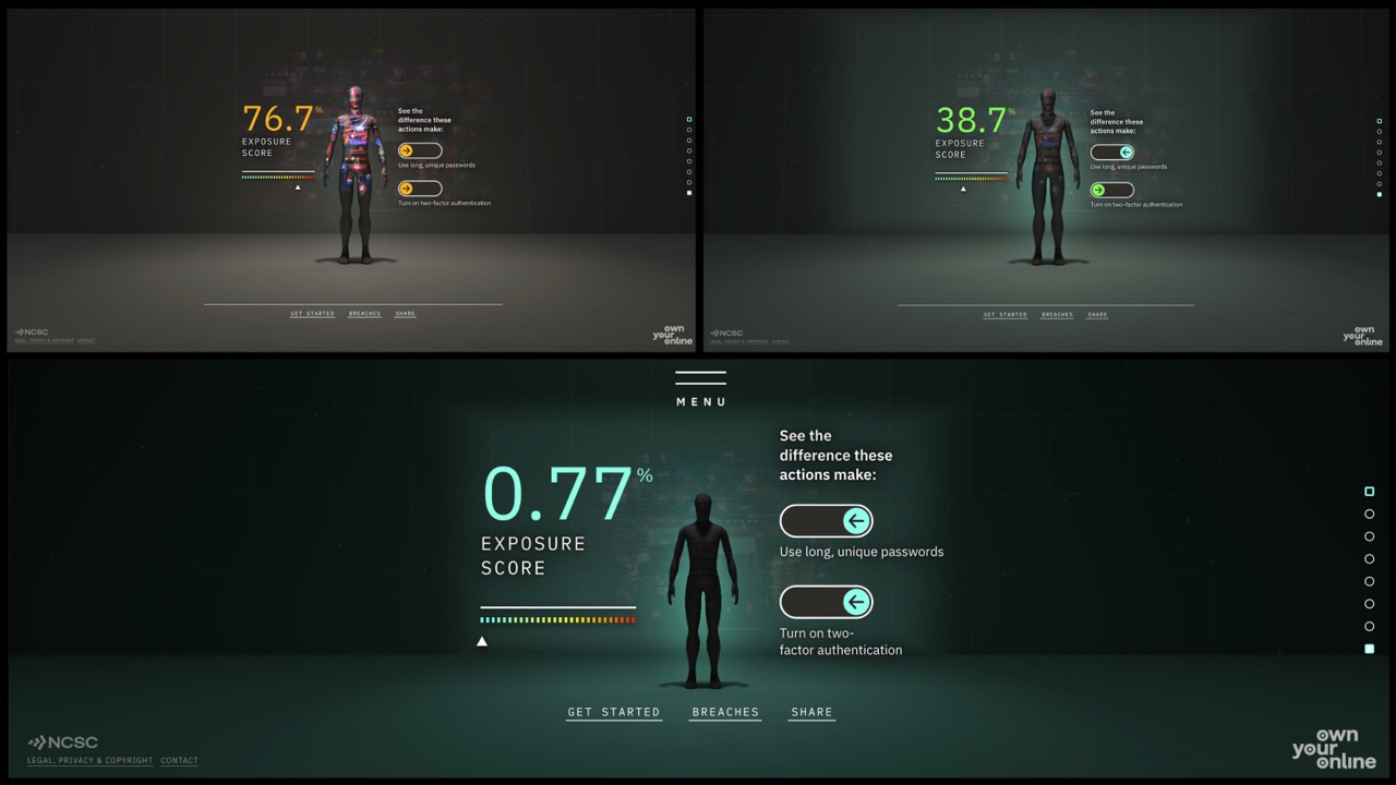 Educational, engaging, emotive, the film and tool connected with a previously disengaged audience. Breaking industry standards for time spent on site, and for engaged interactions. The tool is now being used as an educational resource in universities, and has been praised and adopted by leading cyber security experts.